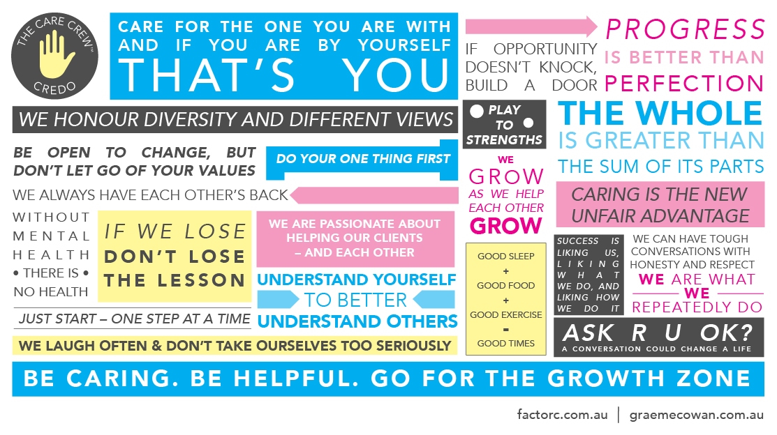 We can customise most facets of the training and campaign materials, including the eLearning, all print materials and running launch events, face-to-face training for managers / facilitators and connecting you with our Care Crew Network or partners in Employee Assistance Program, Mental Health First Aid and coaches.