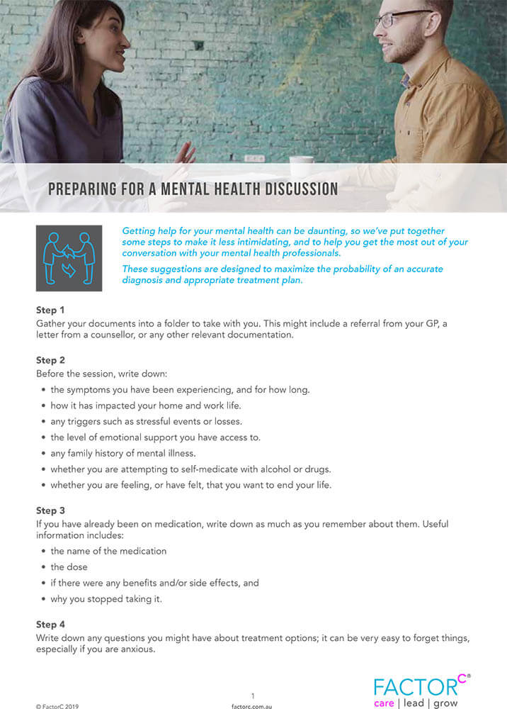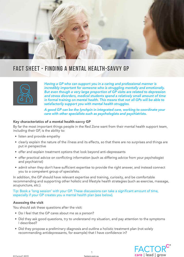 - Guidance on how to find a mental health savvy GP, prepare for a mental health discussion, and to see a psychologist.